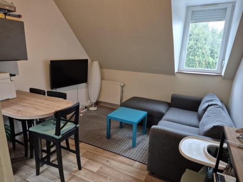 Logement à l’étage comprenant 2 chambres, salon-cuisine, salle de bain, WC et grande terrasse.